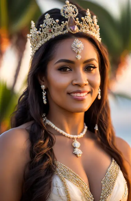 이건 스타일 임베딩으로, 이미지의 주제를 진정한 공주의 모습으로 바꿔주는 거야! 진주 목걸이, 왕관, 밤색 드레스를 떠올려봐! 단순히 프롬프트 끝에 Style-Princess_SD2를 추가(혹은 효과가 약하다면 시작부분에)하면 됐지. 그리고 입체적으로! - 주제는 이제 공주가 되었어. 정말 간단하다는 거야.
