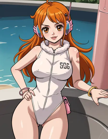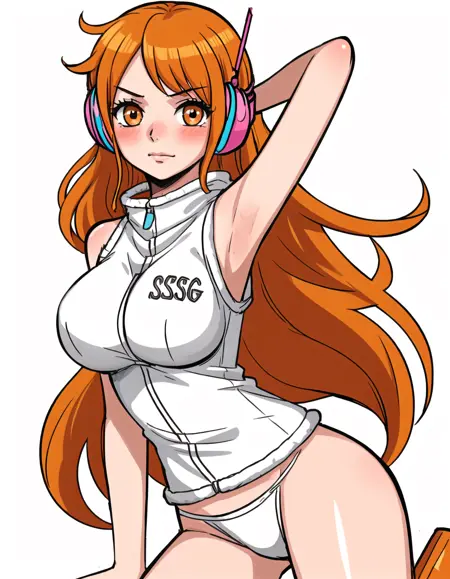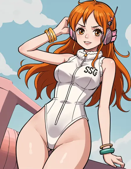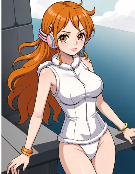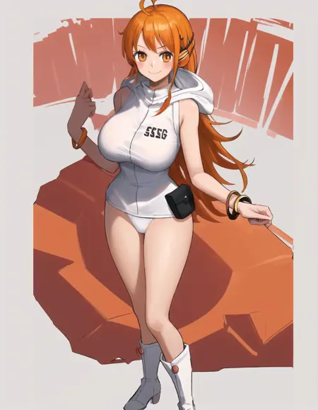 Character prompts: nami, long hair, orange hair, brown eyes
