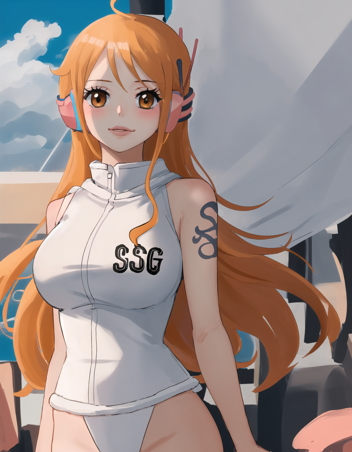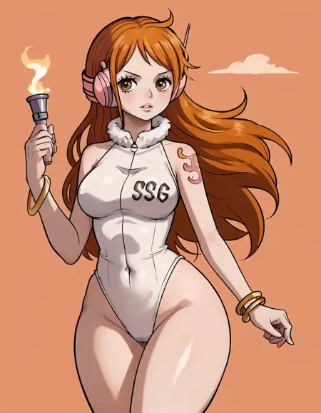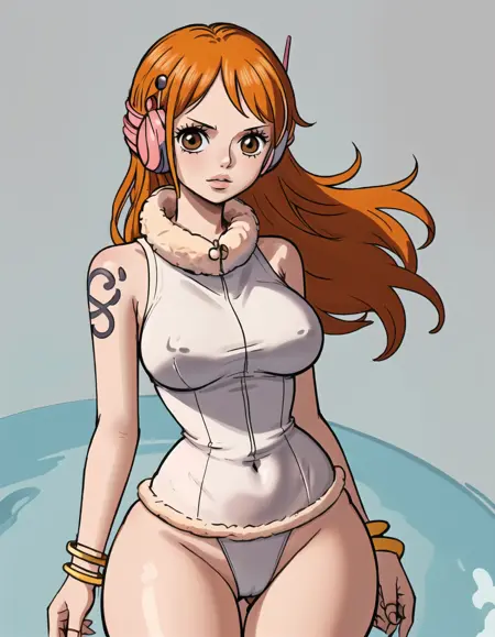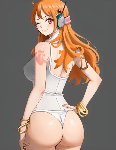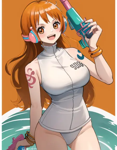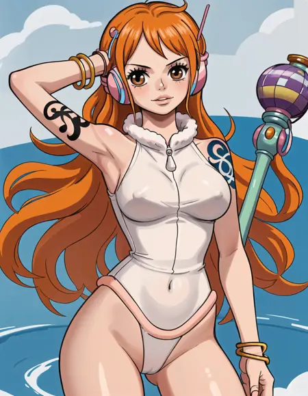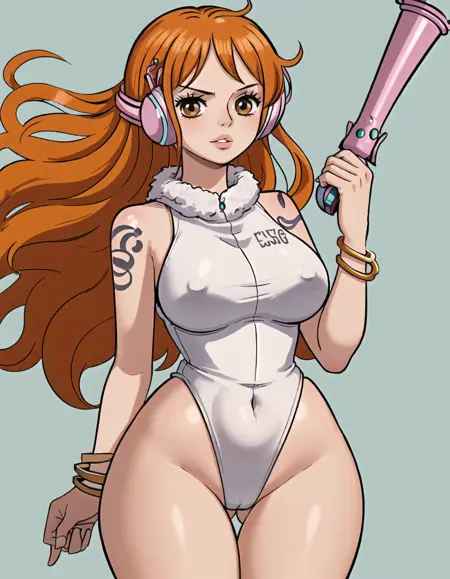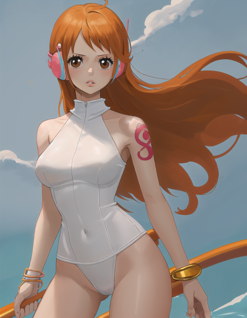 Character prompts: nami (one piece), large breasts, tatoo, orange eyes, orange hair, long hair, shoulder tatoo