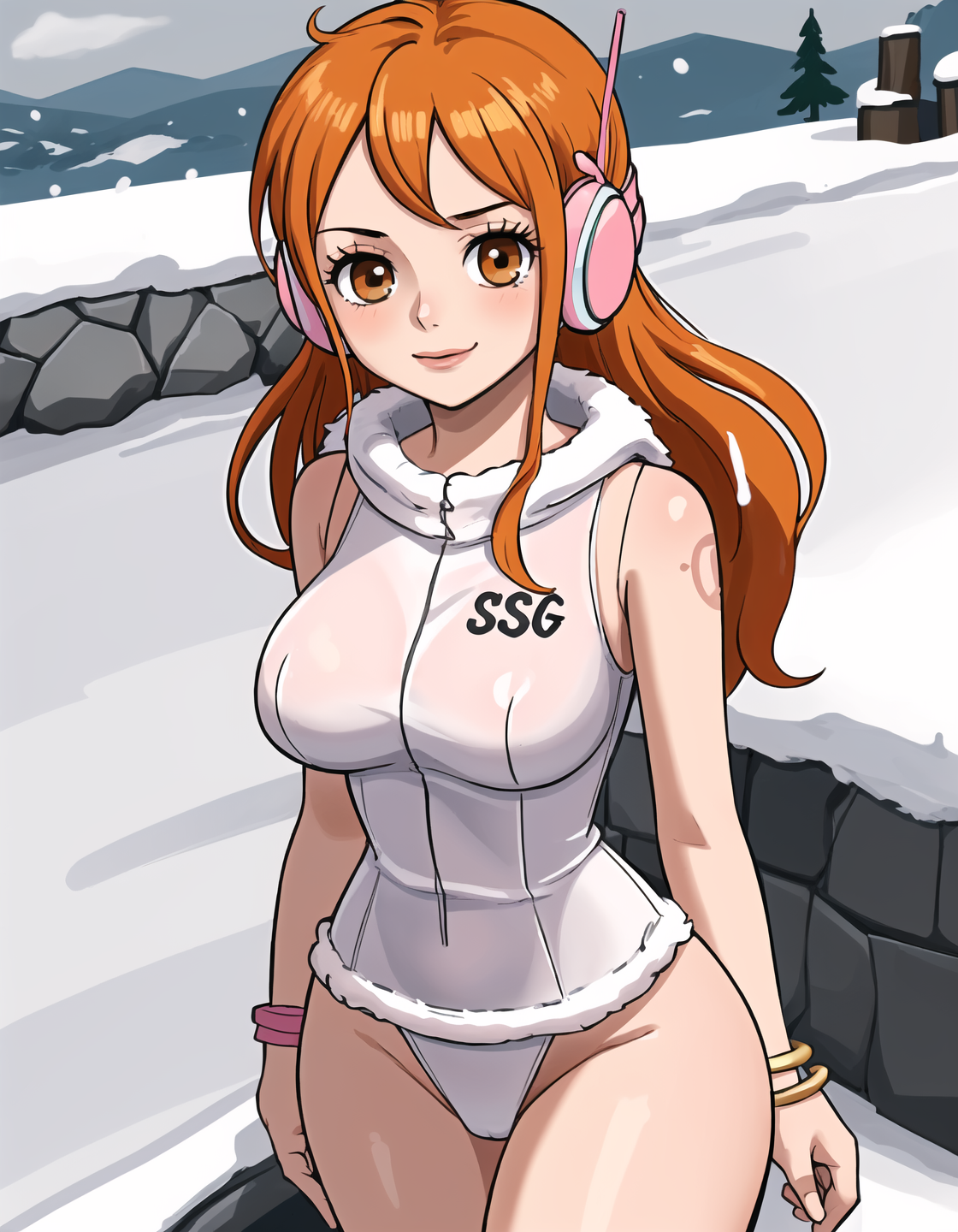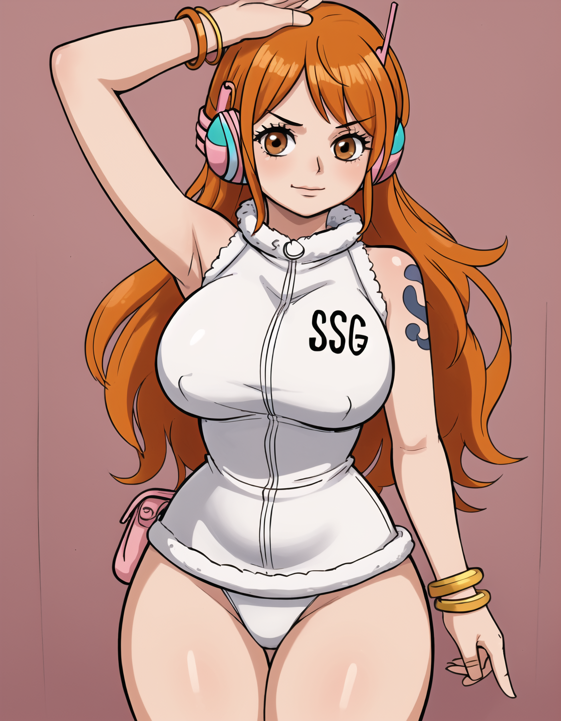 Outfit prompts: headphones, sleeveless, bracelet, jewelry, underwear, swimsuit, fur trim, white topwear, pink pouch, panties