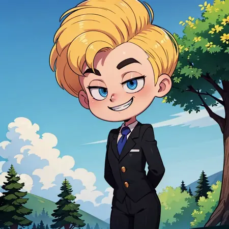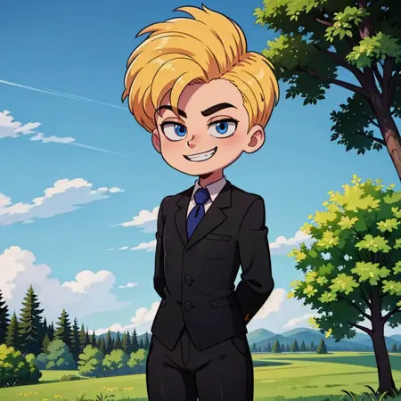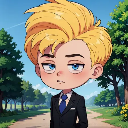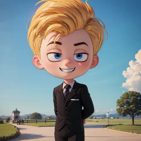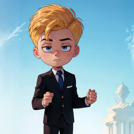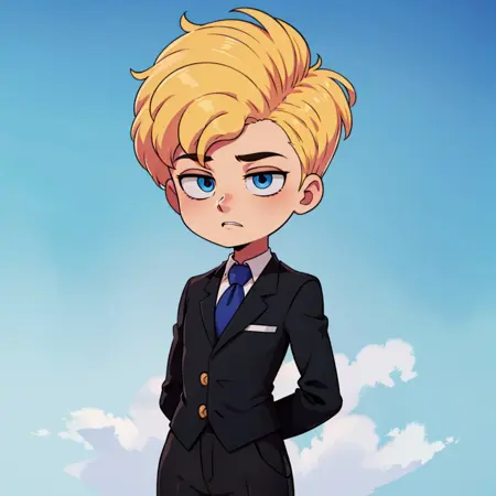 Lou, 1boy, blonde hair, suit, black suit, formal, blue necktie, blue eyes, child, chibi,