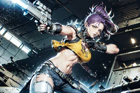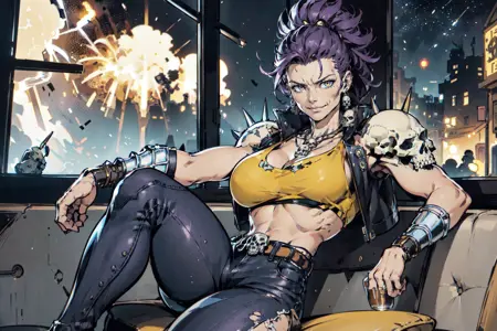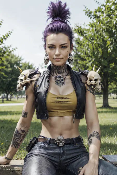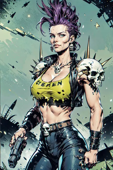 • Trigger : 1girl, long hair, mohawk, earrings with skull, necklace with skull, crop leather jacket, spikes, skull on shoulders, belt with skull, tattoo, torn top, midriff, metallic armguards, leather pants