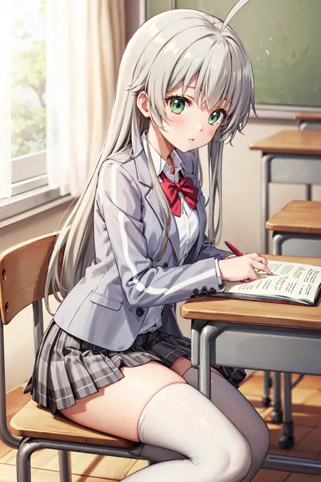 - bbnyaruko, 긴 머리, ahoge, 학교 유니폼, 재킷, 회색 재킷, 빨간 리본 넥타이, 셔츠, 치마, 체크 무늬 치마, (흰 허벅지 양말:1.2), 로퍼