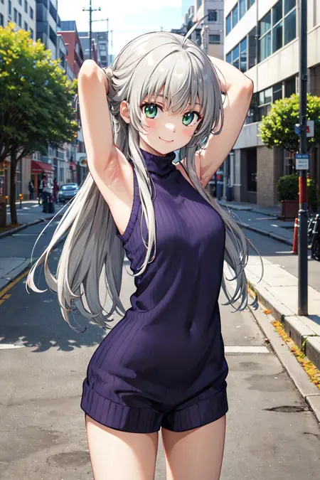 - ccnyaruko, 긴 머리, ahoge, 어깨 노출, 넥타이, 스웨터, 갈색 스웨터, 치마, 체크 무늬 치마, 검은 허벅지 양말