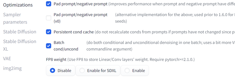 如果你发现生成的图像效果不佳,请禁用fp8weight选项,因为A1111中存在一个bug,启用该选项会导致LoRAs无法正常工作。