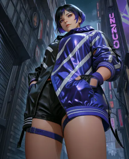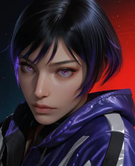 Reina, brown eyes, black hair, two-tone hair, or multicolored hair, purple hair,
