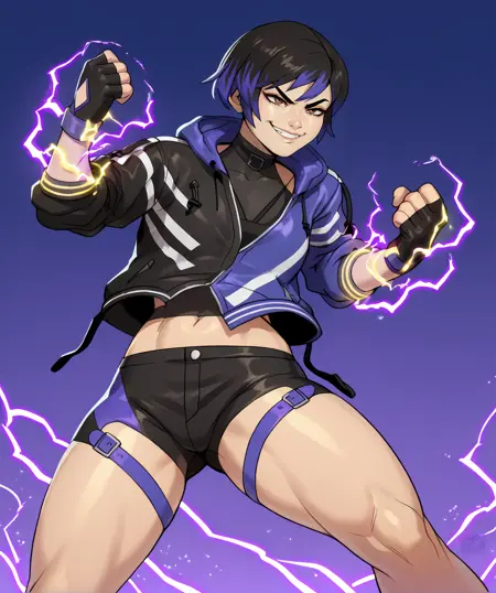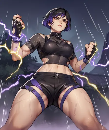 shorts, pantyhose, fingerless gloves, - black crop top, short sleeves, navel, - collar, boots,