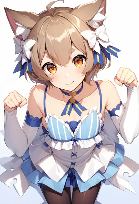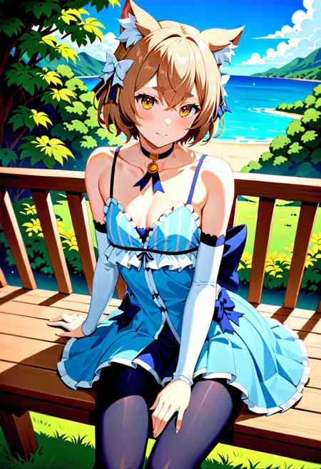 기본 옷차림: 헤어 리본, 드레스, 줄무늬, 리본, 분리된 소매, 팬티스타킹, 파란 목걸이, 꼬리, 데리골, 벗겨진 어깨