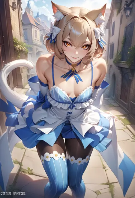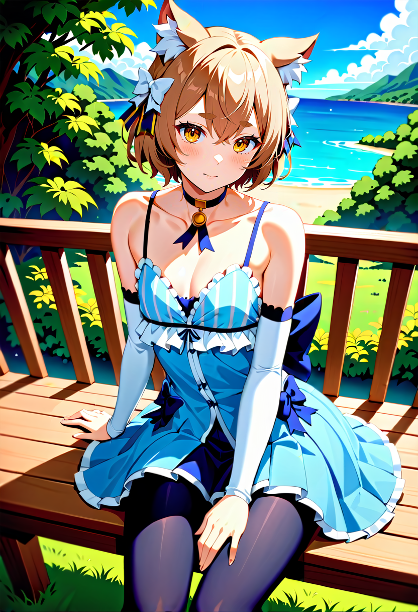 Default Outfit: hair bow, dress, striped, ribbon, detached sleeves, pantyhose, blue choker, tail, collarbone, bare shoulders