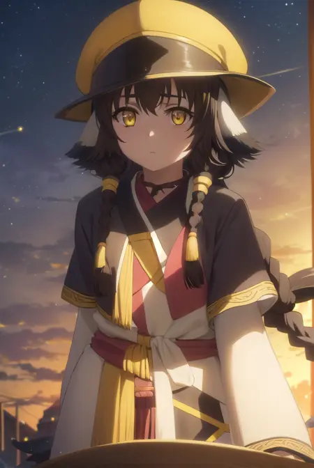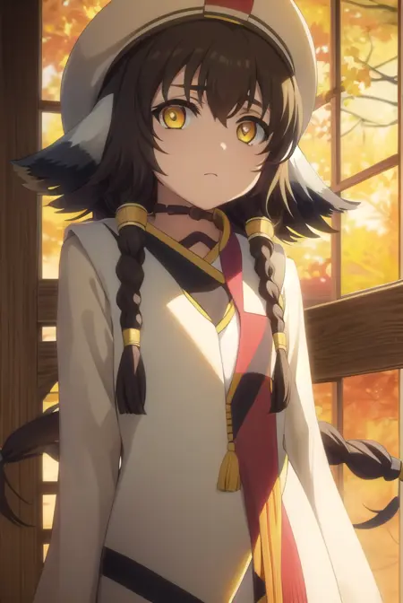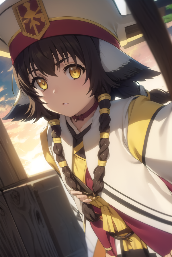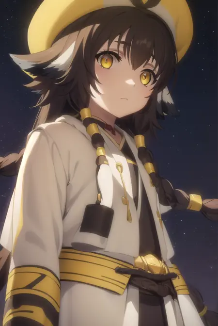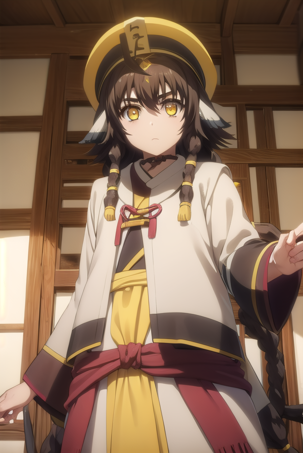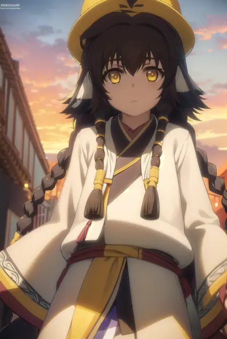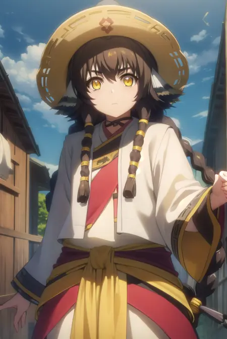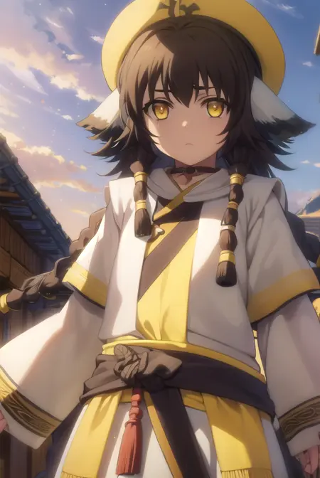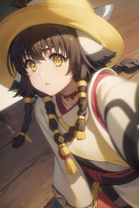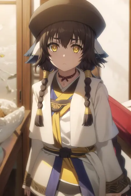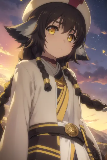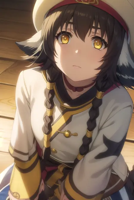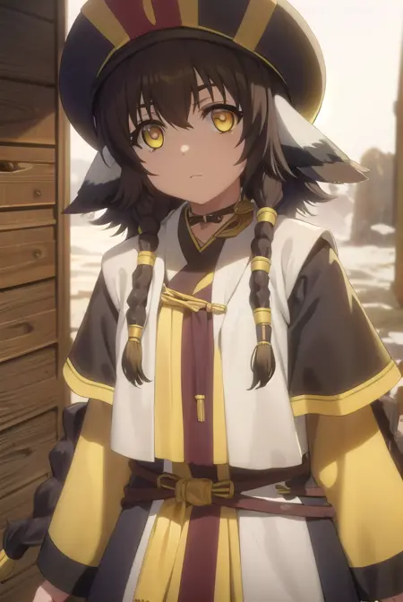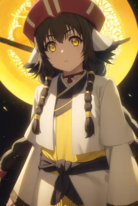 anju, long hair, brown hair, black hair, animal ears, hair between eyes, (yellow eyes:1.5), braid, twin braids,