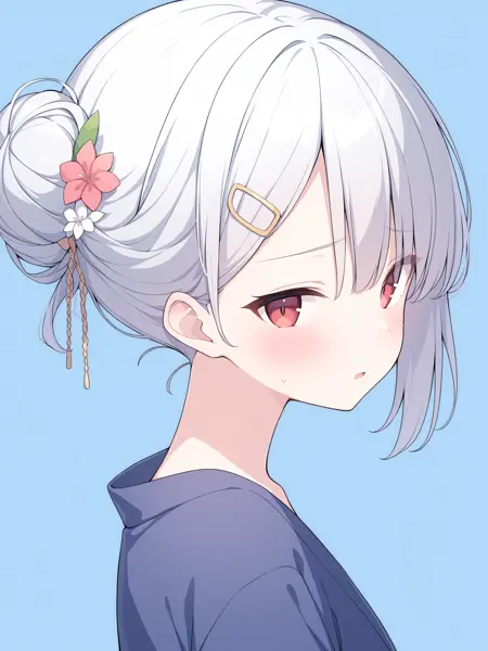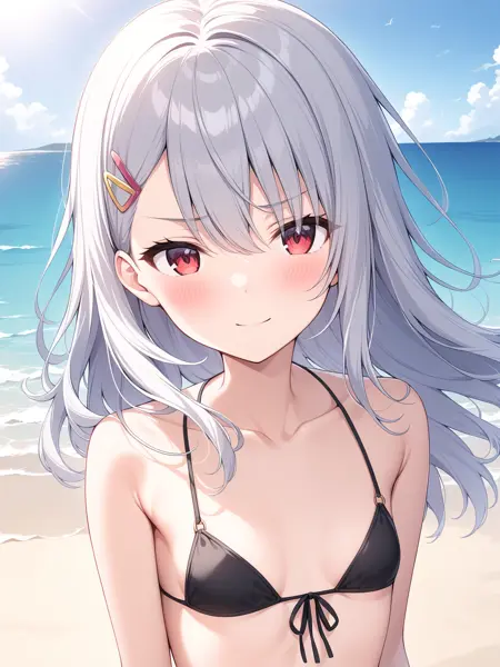 long_hair, red_eyes, silver_hair, hair_between_eyes, hair_ornament, bangs, eyebrows_visible_through_hair, hairclip, small_breasts,