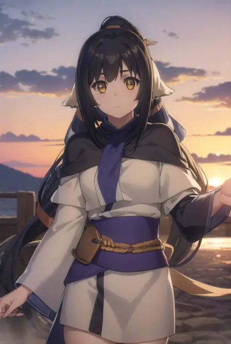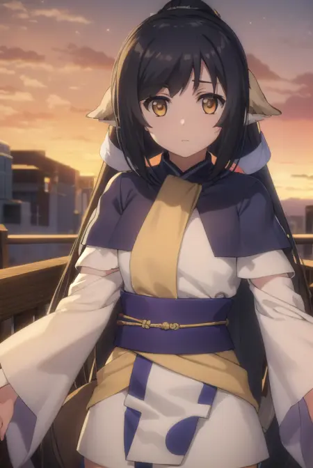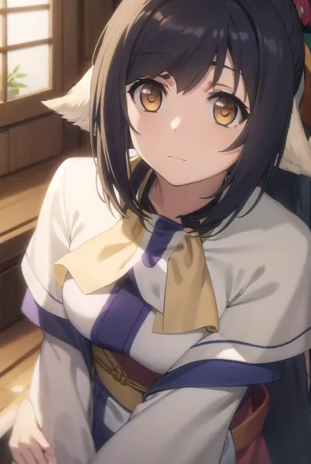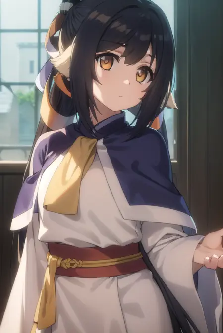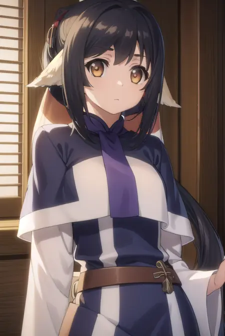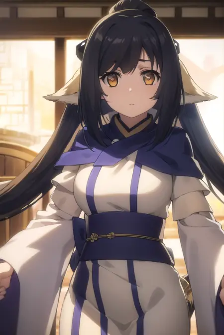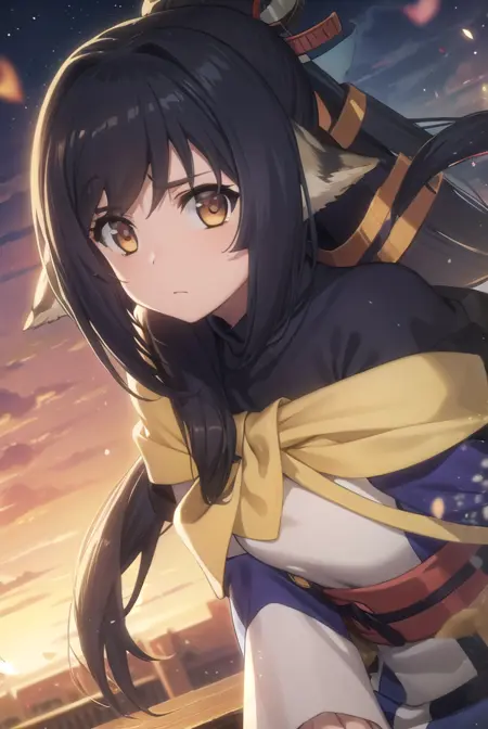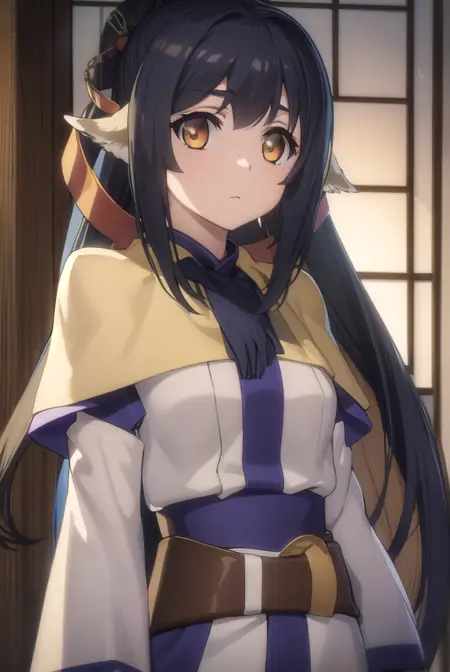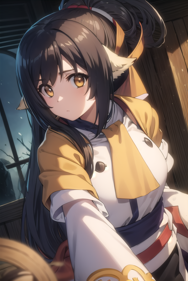 kuon, long hair, black hair, hair ornament, animal ears, (brown eyes:1.5), very long hair, ponytail, low-tied long hair,