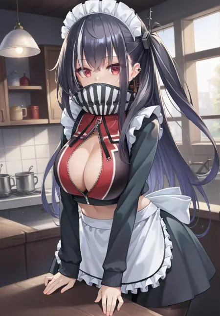 女仆极速达 (urban_maid): u47_(azur_lane), multicolored_hair, long_hair, black hair, red eyes, one side up, hair ornament, cross_earrings, covered_mouth, unzipped, apron, skirt, crop_top, long_sleeves, waist_apron, maid_headdress, midriff, cleavage,