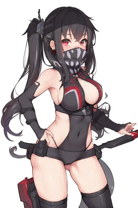 原版(original):u47_\(azur_lane\), multicolored_hair,long_hair,one side up,red eyes,hair ornament,cross_earrings,unzipped,elbow gloves, one-piece_swimsuit,covered_mouth,