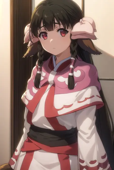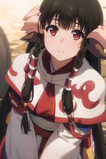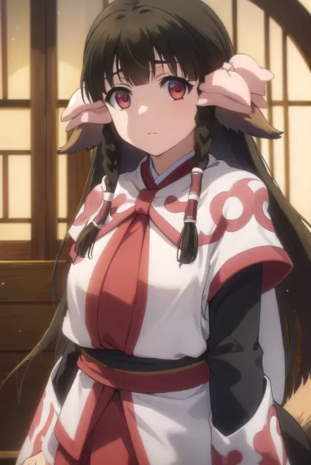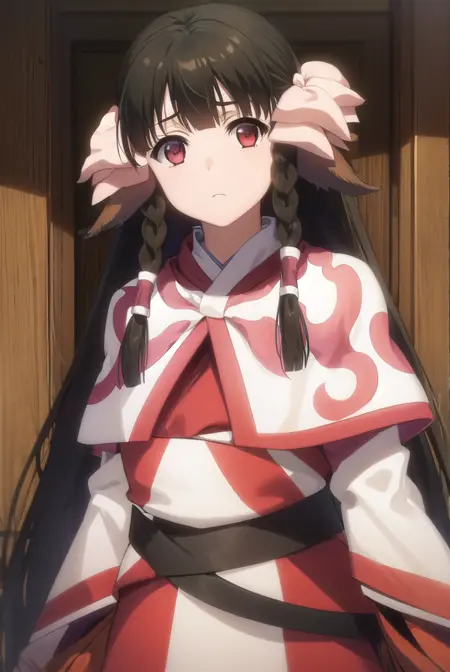 rurutie, long hair, bangs, black hair, animal ears, sidelocks, hair tubes, (red eyes:1.3), bow, hair bow, braid, twin braids,