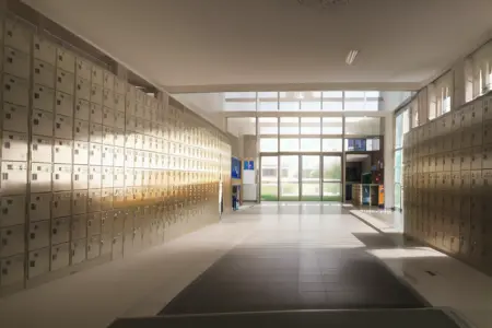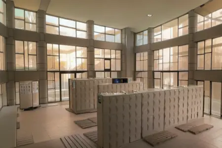 Prompt:getabako, scenery, locker, indoors, school, window, hallway, ceiling light, sunlight, ceiling, tiles, reflective floor, tile floor, door, shoe locker,