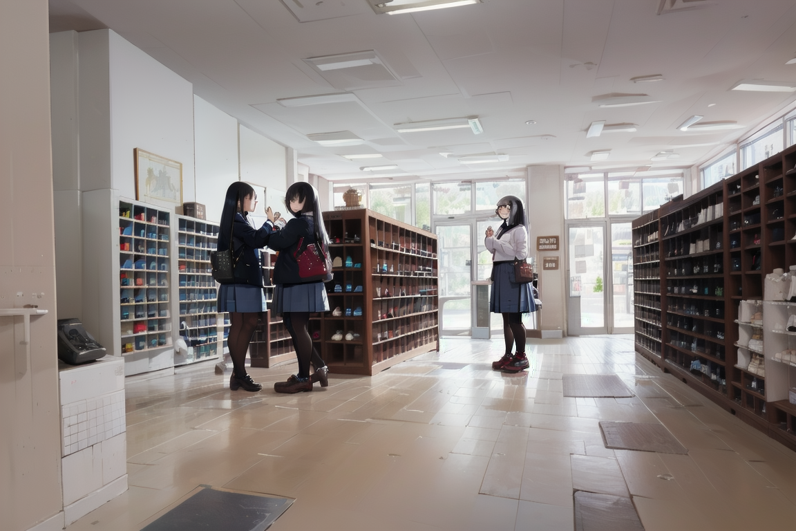 Prompt: getabako, scenery, indoors, shelf, tiles, ceiling light, window, tile floor, shop, reflective floor, ceiling