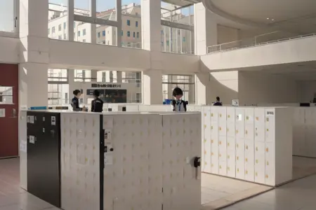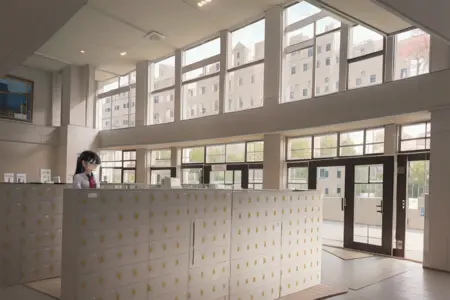 Prompt:getabako, scenery, locker, indoors, school, window, hallway, ceiling light, sunlight, ceiling, tiles, reflective floor, tile floor, door, shoe locker,