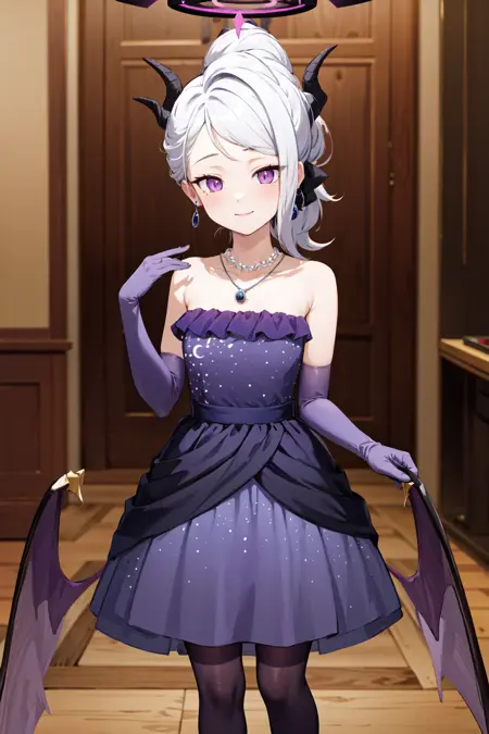 - cchina、ハロー、角、長い髪、ポニーテール、片側の髪、分け目のある前髪、イヤリング、ネックレス、ストラップレスドレス、紫のドレス、肘まで手袋、紫の手袋、(翼:1.2)、低めの翼、(紫のレギンス:1.2)、黒い靴