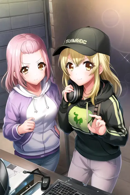 ピンク髪, 黄色い目, 短い髪, 笑顔, 1人, 単独, 口を開けている, 視線が閲覧者に向かっている, 長い袖, 複数の少女, ハット, ジャケット, 茶色い目, シャツ, ヘッドフォン, 2人, 持っている, リボン, 髪の装飾品, 屋内