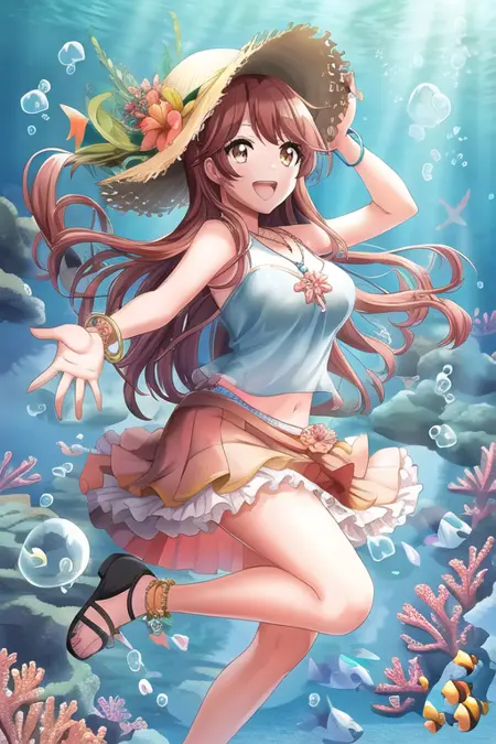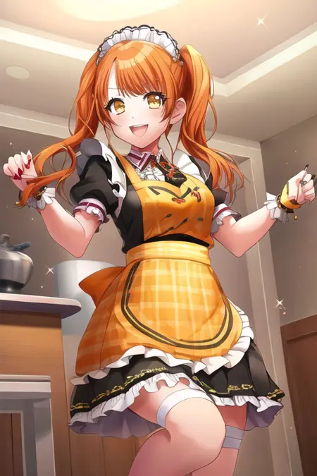 長い髪, フロントカット, 笑顔, 黄色い目, 茶色の髪, 赤色の髪, 1人, 単独, 口を開けている, 視線が閲覧者に向かっている, 赤ら顔, シャツ, 長い袖, スカート, フリル, ドレス, 乳, 茶色い目, 複数の少女, 個性のある光る