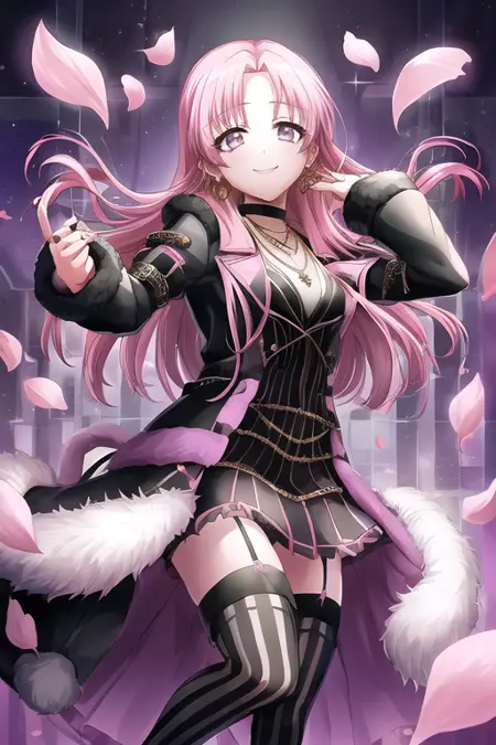 長い髪, 笑顔, アクセサリー, 乳, ピンク髪, フロントカット, ドレス, ピアス, 1人, 視線が閲覧者に向かっている, 灰色の目, 分かれたフロントカット, 単独, 屋内, 持っている, 複数の少女, 長い袖, 2人, ベルベット, 口を開けている