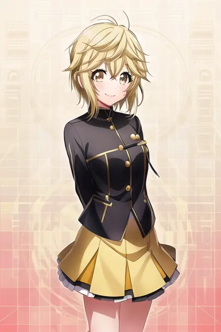 金髪, 短い髪, 笑顔, 黄色い目, 口を開けている, 1人, 視線が閲覧者に向かっている, 持っている, 単独, フロントカット, シャツ, 赤ら顔, 長い袖, アクセサリー, ロングパンツ, 複数の少女, 楽器, ギター, 茶色い目, :d