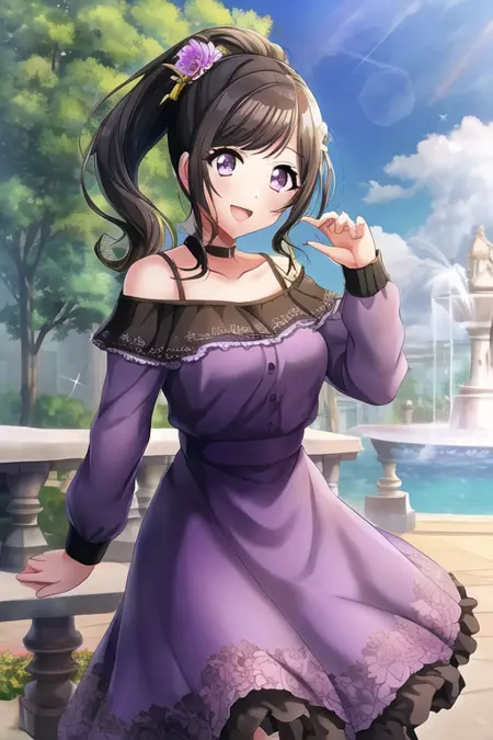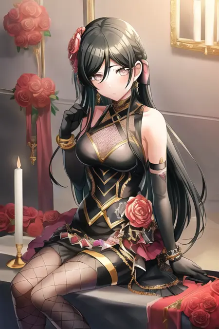 黒髪, 長い髪, フロントカット, アクセサリー, 灰色い目, 1人, 口を開けている, 視線が閲覧者に向かっている, 単独, 乳, 笑顔, 持っている, ドレス, 長い袖, シャツ, 髪のブローチ, 複数の少女, ベルベット, 花, 黒目