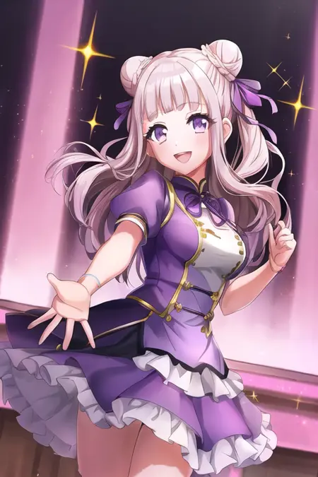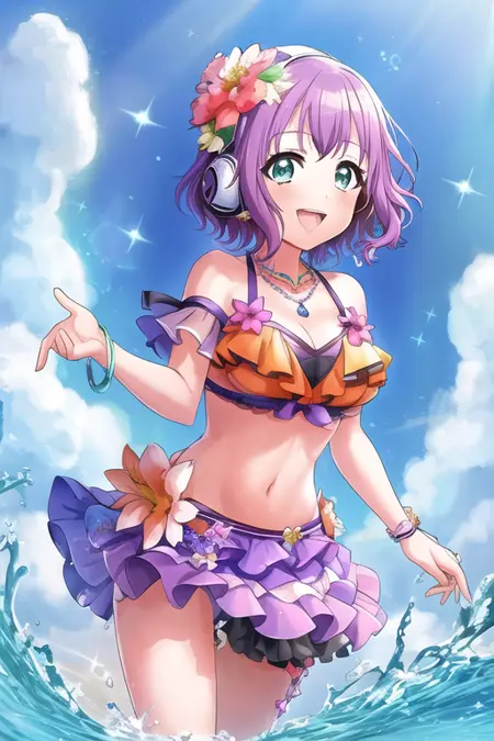 紫髪, 笑顔, 口を開けている, フロントカット, アクセサリー, 1人, 視線が閲覧者に向かっている, 乳, 単独, 青い目, 短い髪, 花, 持っている, 眉の間の髪, 髪の装飾品, シャツ, 中程度の乳, 個性のある光る, ブレスレット, :d