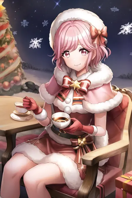 ピンク髪, ピンク目, 短い髪, 笑顔, フロントカット, 口を開けている, 髪の装飾品, 個性のある光る, 視線が閲覧者に向かっている, スカート, 1人, 単独, 赤ら顔, リボン, 長い袖, ヘアクリップ, シャツ, 屋内, 持っている, :d