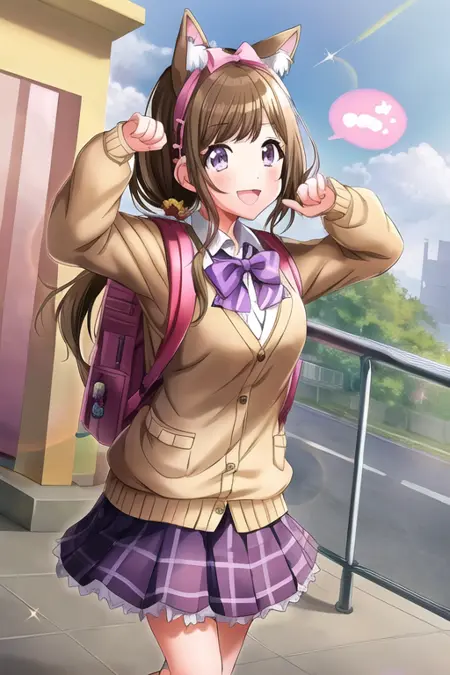 長い髪, 茶色い髪, 茶色い目, 笑顔, 視線が閲覧者に向かっている, フロントカット, 1人, 単独, ジャケット, 口を開けている, 帽子, スカート, 乳, 持っている, 長い袖, アクセサリー, ベースボールキャップ, 複数の少女, 眉の間の髪, シャツ