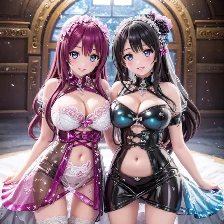 최고의 품질, (artstation에서 트렌드), 포스터 일러스트, (2걸스:1.2), (고품질 비클림 출판시대 귀여운 소녀), (완성도 높은 복잡한 하렘 춤꾼 복식과 골반 커튼:1.2), (카멜토:1.2), 안켓, (목 장식 및 볼륨 및 가려진 젖꼭지), 보브 컷, (복잡한 하트 뒷면 드레스:1.2), 옆으로 흘러내린 머리카락, 피크시 컷, (투명 드레스:1.2), (아름다운 얼굴), (섹시한 눈), 디테일한 얼굴, 디테일한 눈, 경쾌한 미소, 반짝이는 입자 구름, lora:flat2:-1,