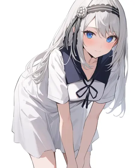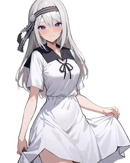 TAG:Shirogane Kei,1girl,shuuchiin academy school uniform,solo,blue eyes,bangs,white dress,long sleeves,grey hair,hair between eyes,black ribbon,neck ribbon,black hairband,v-shaped eyebrows,collarbone,black pantyhose,collared dress,very long hair