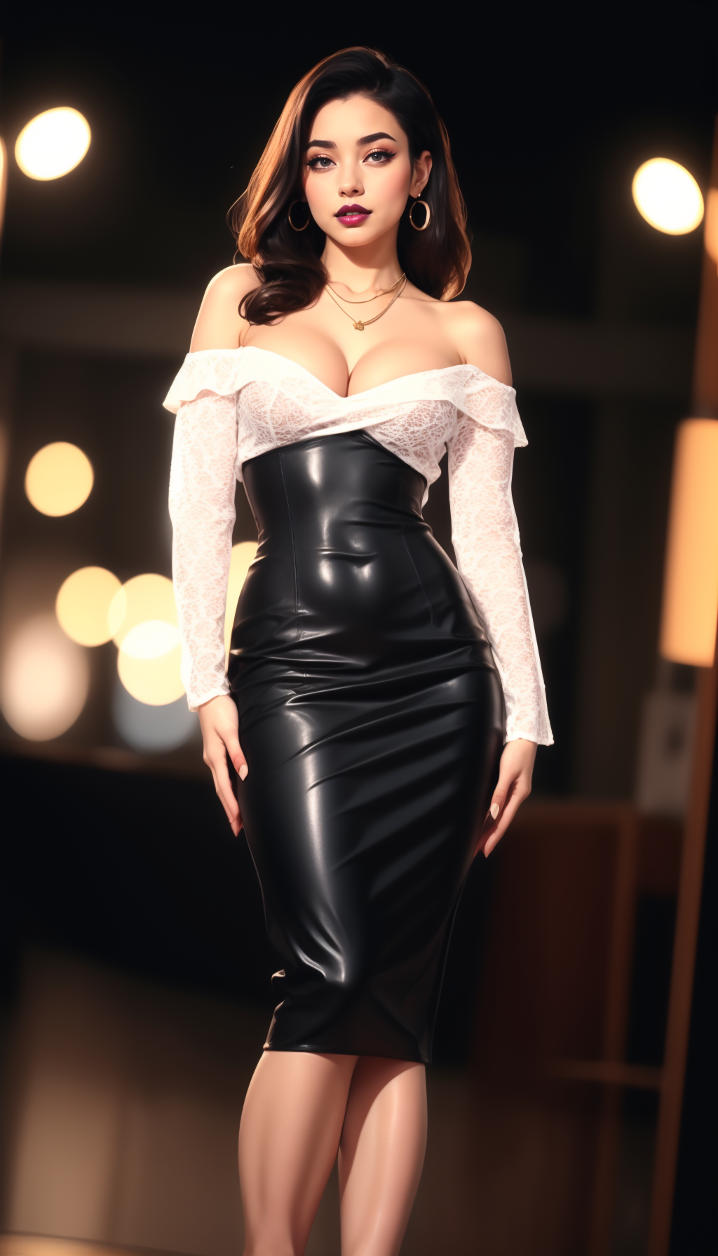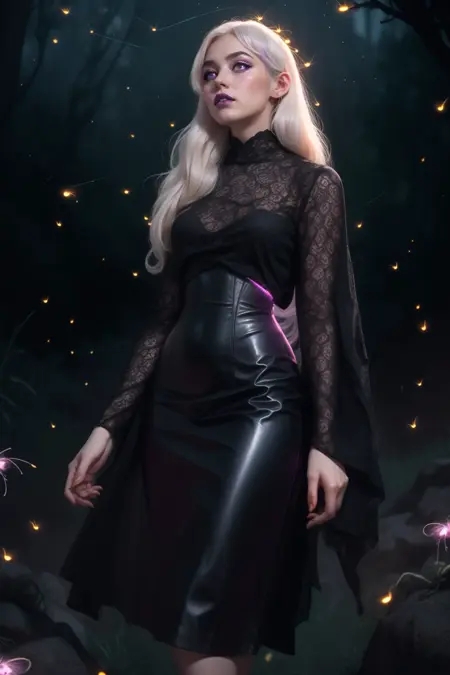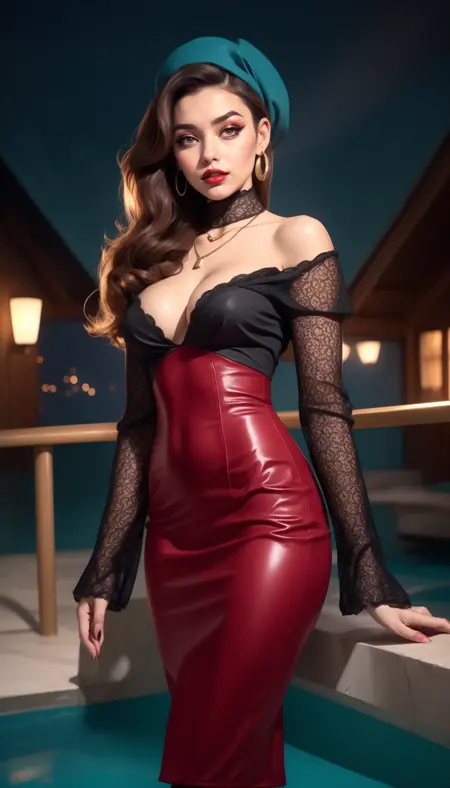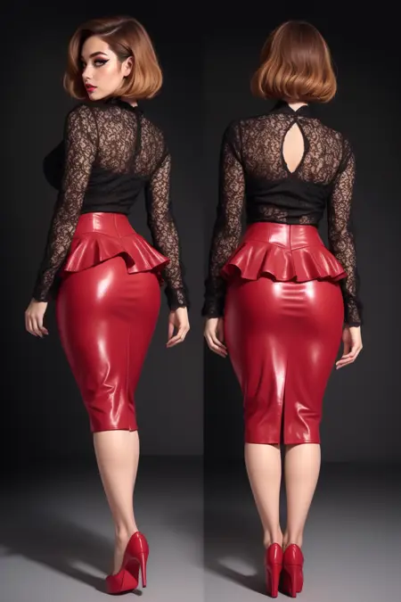This is a mesh top with a hobble skirt (hobble goes below the knee, pencil goes above the knee) However in my experience SD doesn't really give a shit about hobble vs pencil, for the sake of this the prompt is pencil. The x factor on this is that the pencil skirt almost has a STTNG vibe with a asymmetrical accent and is pretty high-waisted, so corsets flow into it usually, almost a bodycon below the breast. This is the super fun part about this one.