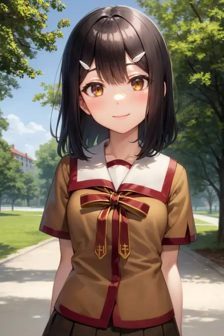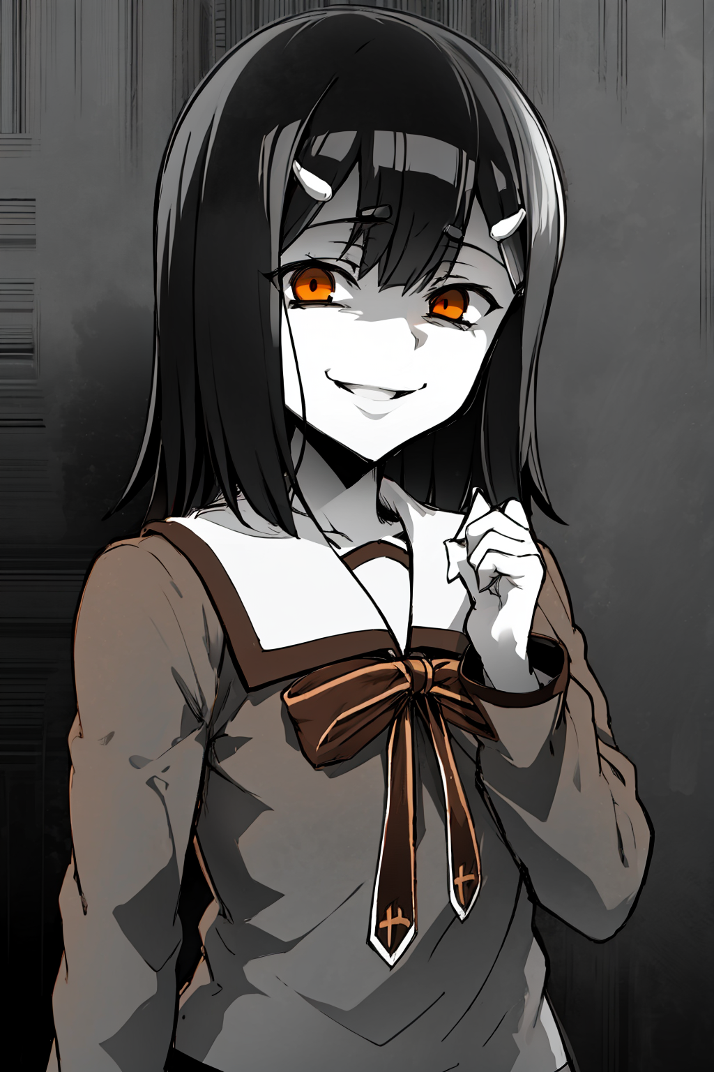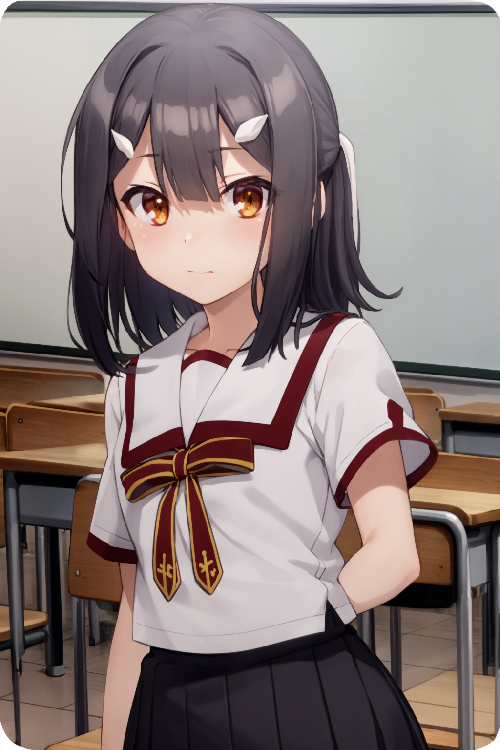 Basic prompts : 1girl, black hair, brown eyes, hairclip, bangs
