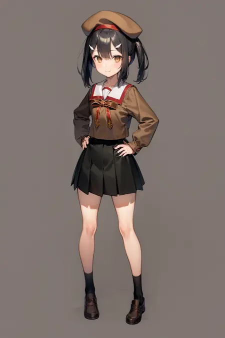 Brown school uniform prompts : miyuschoolb, brown school uniform, long sleeves, skirt, black socks, shoes