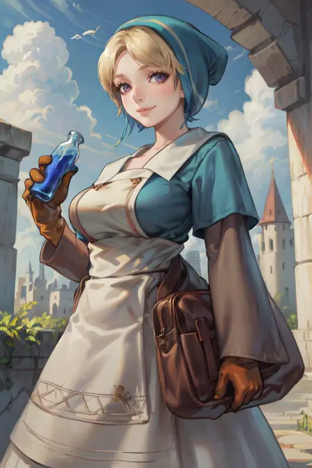Default Outfit: ChemistFFT, short hair, blonde hair, brown eyes, blue head scarf, blue dress, long sleeves, apron, bag, gloves, boots,