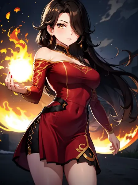 ➜ CinderFall, yellow eyes, long hair, hair on the side, black hair, hair over one eye, earrings, red dress, red sleeves, bare shoulders