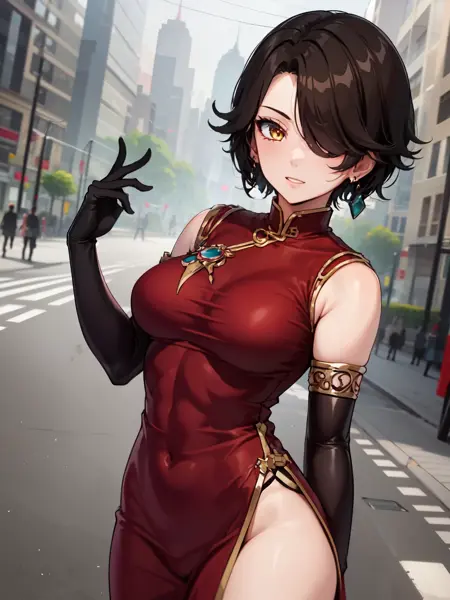 ➜ CinderFall, yellow eyes, short hair, black hair, hair over one eye, scar, earrings, black gloves, elbow gloves, red dress, china dress, jewelry