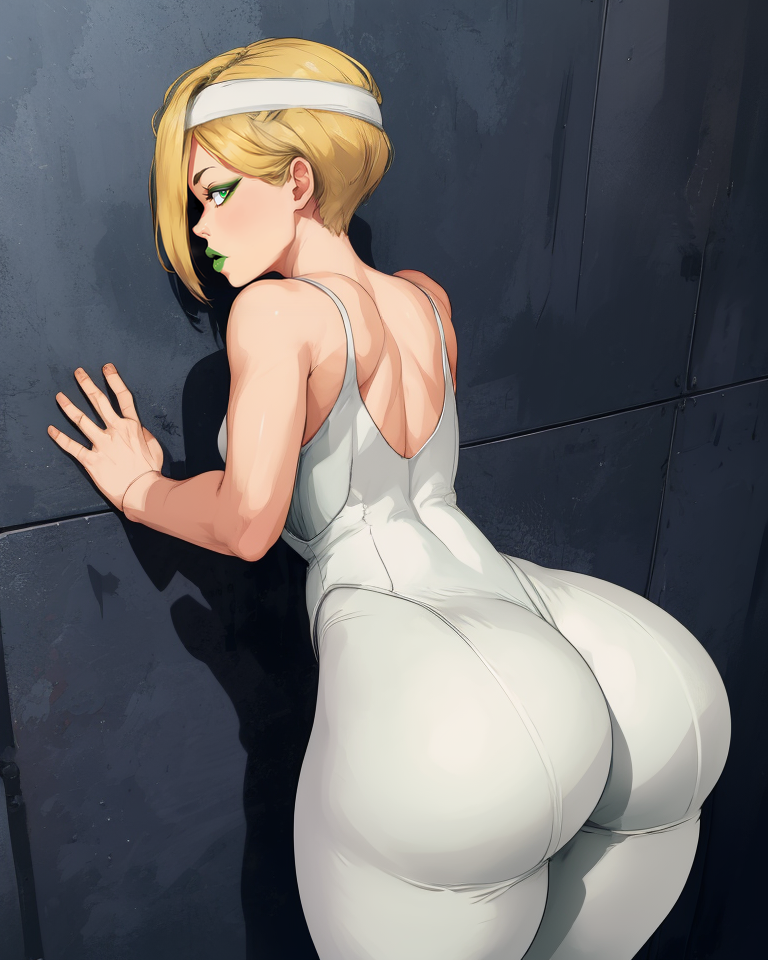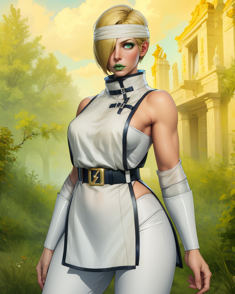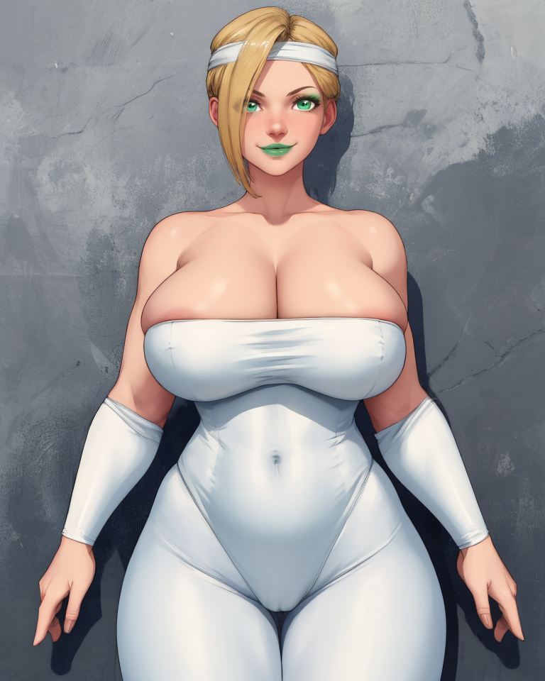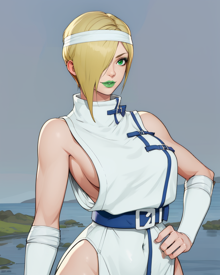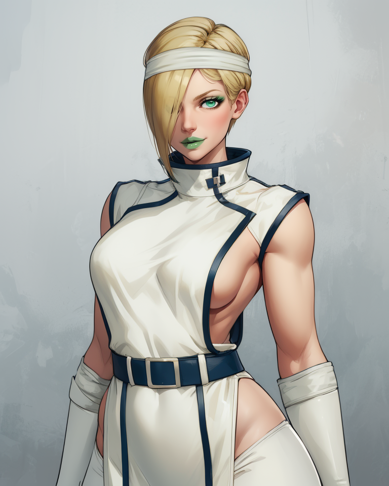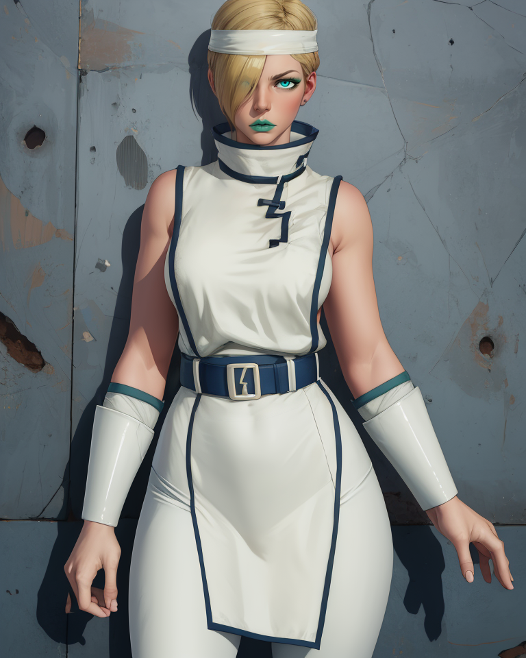 white headband, white bodysuit, or leotard, - collarbone - white turtleneck, belt, bracer, or arm wraps, short pelvic curtain, toeless footwear,