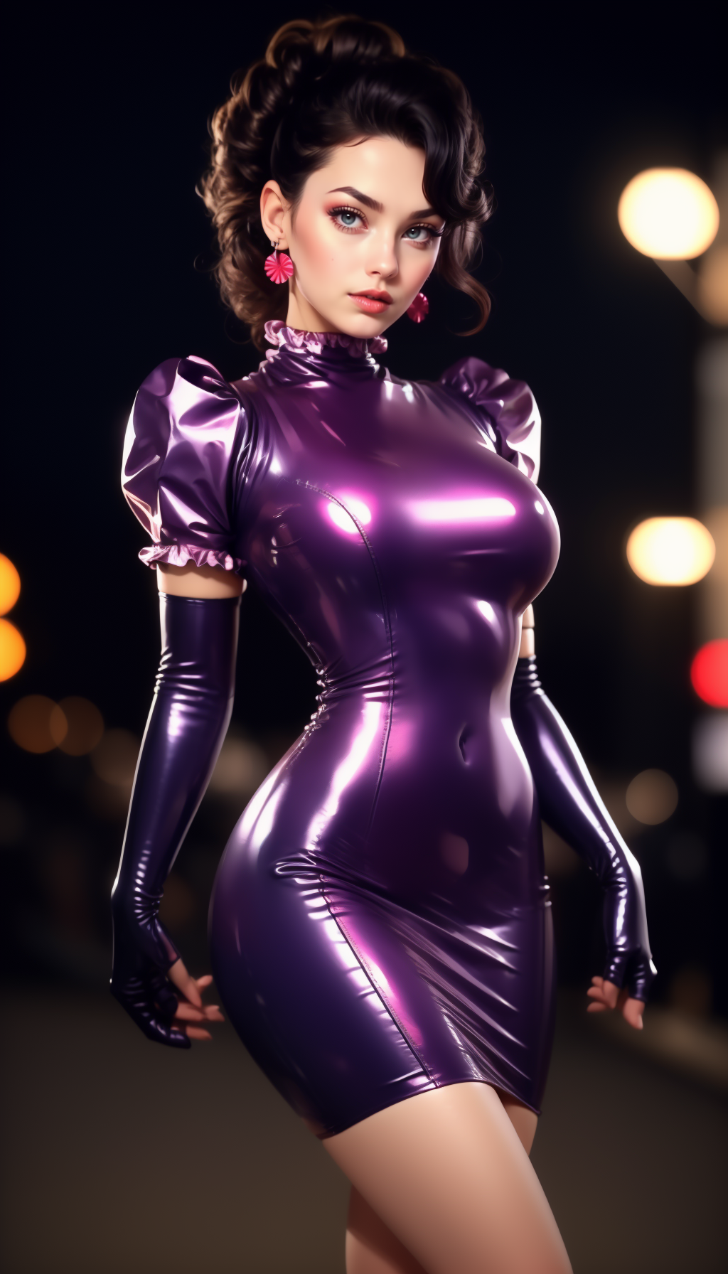 Invoke with dr3ss, bodycon dress, latex, skirt, (elbow gloves), gloves, ruffled poofy sleeves
