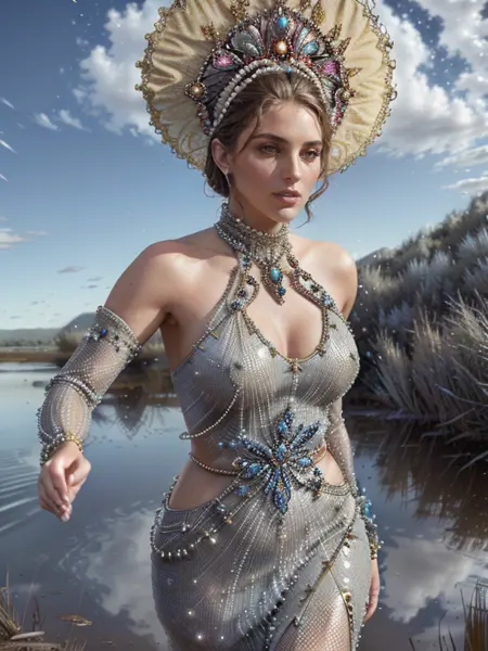 “sl4v1ccr0wncr33p” — 착용자와 교차하는 거대한 화려한 왕관을 생성합니다. 특히 프롬프트에 “man”이 포함된 경우 더욱 뚜렷합니다.