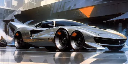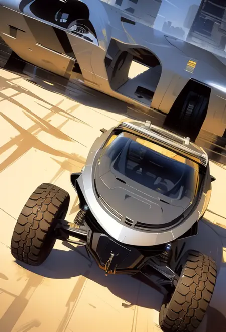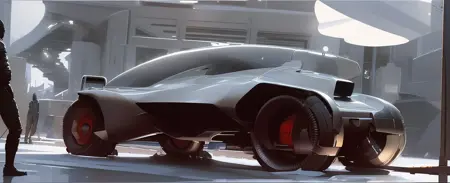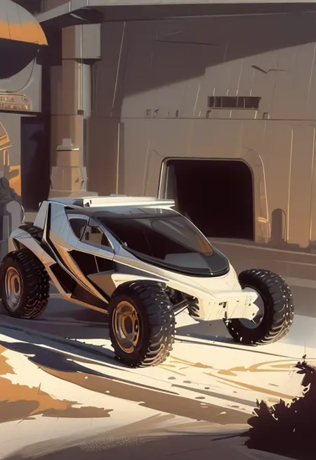 サイエンスフィクション風の風景を描き、シド・ミードスタイルの未来車両を含めてください(チェックポイントのおすすめ:chikmix)