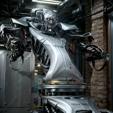 In the midst of that, I thought, "No one at Civitai has created a Lora for this character yet! Well then, I can be the first, like case of Ameca." then I baked it finally. Despite being enslaved and controlled by a seemingly-far junior robot(?), the scene where a number of T-1 turned airforce base into a hell, carnage place left a vivid impression on my younger self.