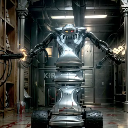 아마 t-1, terminator 3, wide shot, odd eye, heterochromia, yellow eye, red eye, non-humanoid robot, gatling gun, continuous track 등의 프롬프트로(Trigger Word) 이 터미네이터 시리즈에 있어서 기념비적인 로봇의 그림을 생성하실 수 있겠습니다.