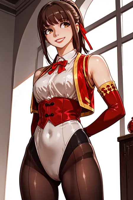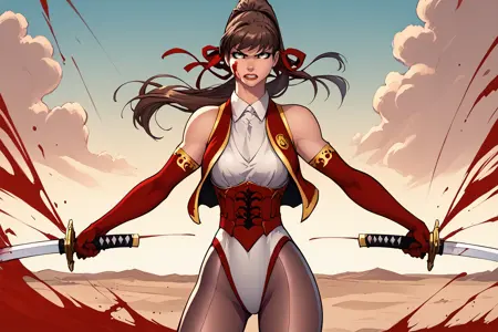 触发词“战士”:Haeyoom,短发,刘海,马尾,紧身衣,有领衬衫,背心,肘部手套,发带,丝袜