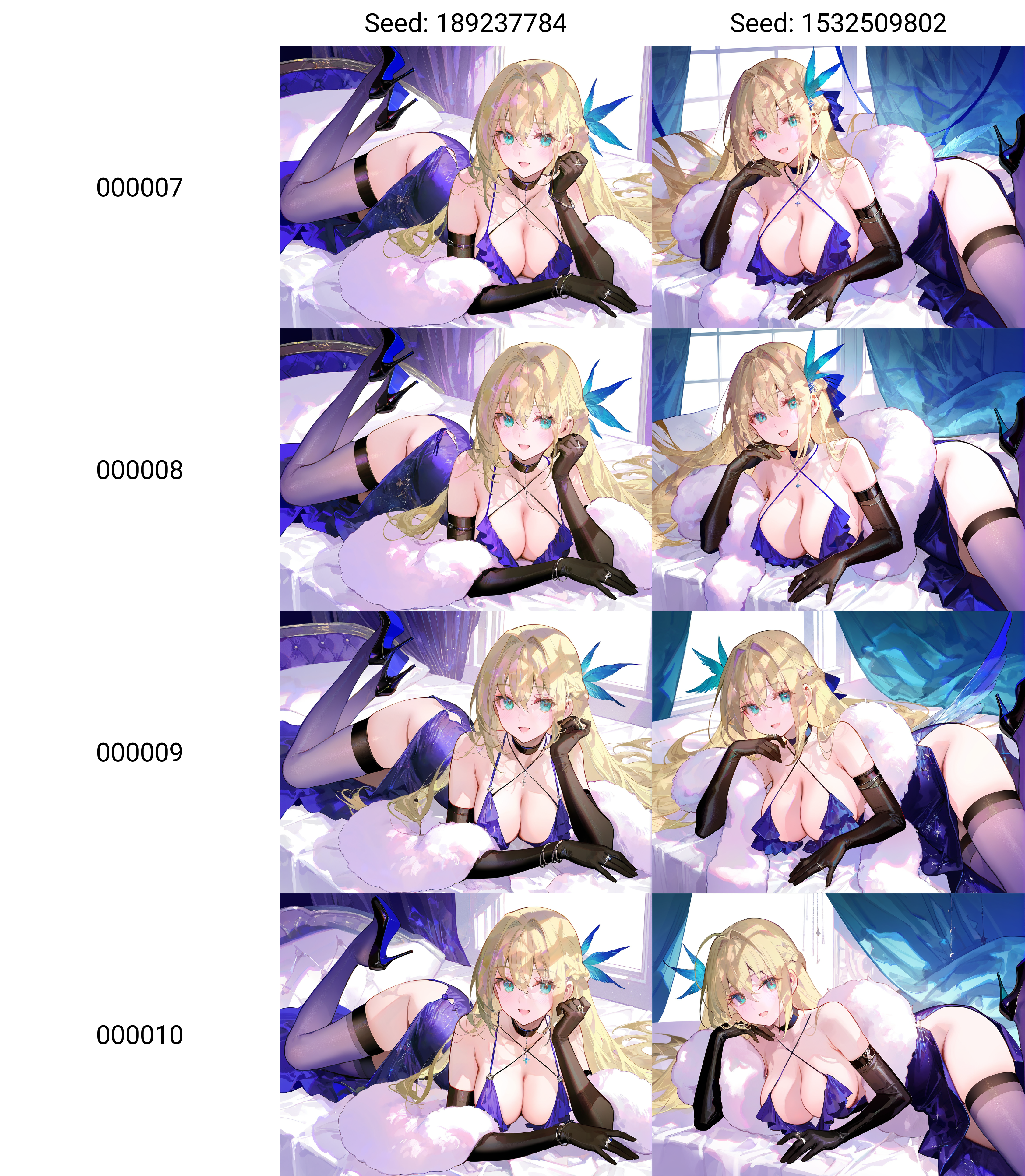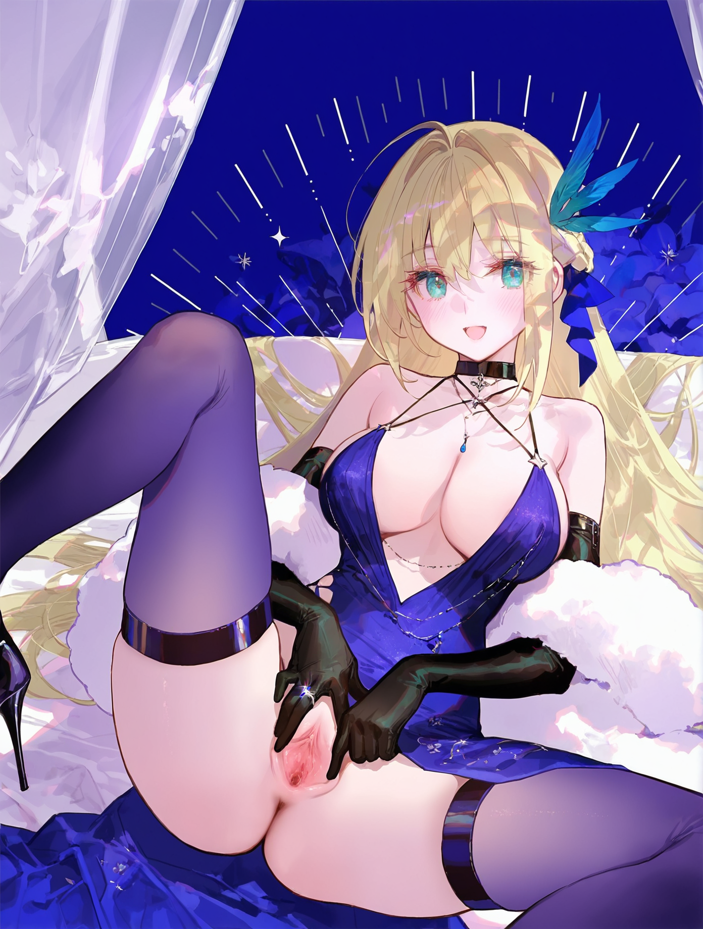보조적인 트리거어(선택적): 1girl, 금발 머리, 솔로, 매우 긴 머리카락, 아쿠아 눈, 블랙 팔꿈치장갑, 블랙 싸이클스, 블랙 목걸이, 큰 가슴, 옆면 슬릿, 블랙 스틸레토 하이힐, 금속 피encing 스트랩, 반지, 크로스히터, 보라색 드레스, 반머리 헤어스타일, 귀걸이, 어깨 노출, 절반 진동 라인, 옆면 블랙 뿔 모양 헤어 액세서리, 눈 사이 머리카락, 파란 깃털 헤어 액세서리, 짧은 소매 없음, 흰 깃털 보아, 파란 나비 허리 액세서리 (어떤 의미에서 복원을 위해 반드시 입력해야 할 수도 있습니다)