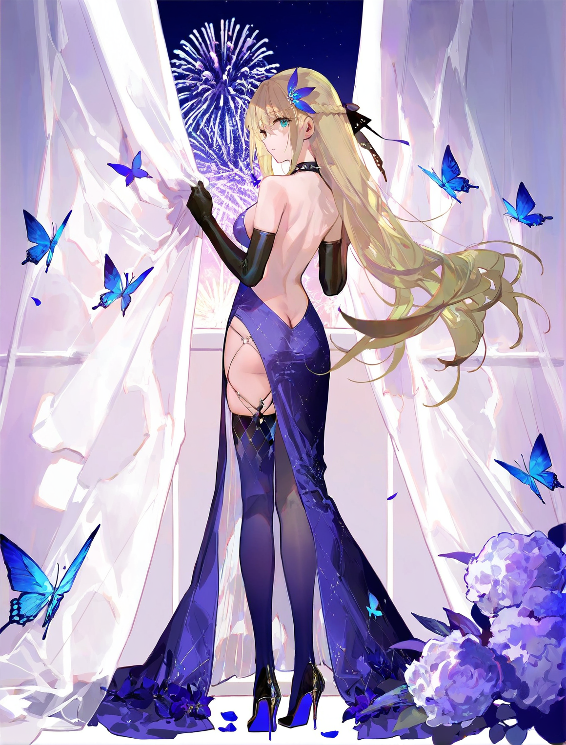 lexington (cv-2) (all stars feast) (broken) (warship girls r), 검정색 고무 밴드, 1girl, 금발 머리, 블랙 스틸레토 하이힐, 솔로, 엉덩이, 시선을 관객에게 보내는 모습, 전신, 뒤를 돌아보는 자세, 보라색 꽃, 허벅지, 서서, 흰 배경, 아쿠아 눈, 보라색 프릴 드레스, 블랙 팔꿈치장갑, 파란 깃털 헤어 액세서리, 블랙 뿔 모양 헤어 액세서리, 반머리 헤어스타일, 보라색 머리띠, 블랙 목걸이, 커튼 잡기, 흰 커튼, 파란 나비, 꽃잎, 어깨 노출, 희뿌연 보라색 싸이클스, 골드 아르-gay 레그 액세서리, 등이 드러나는 드레스, 매우 긴 머리카락, 등에서 바라보는 자세, 밤하늘, 밤, 엉덩이 틈, 공중 불꽃놀이, 등 노출, 짧은 소매 없음, 옆면 슬릿, 긴 드레스