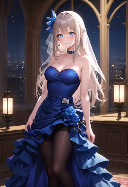 非强制性辅助触发词为:1girl, blonde hair, solo, very long hair, aqua eyes, black elbow gloves, black thighhighs, black choker, large breasts, side slit, black stiletto heels, metal fishnet thigh straps, ring, criss-cross halter, purple dress, half up braid, earrings, bare shoulders, cleavage, plunging neckline, side black spiked hair ornament, hair between eyes, blue feather hair ornament, sleeveless, white feather boa, blue butterfly waist ornament(从某种意义上讲,为了还原真实形象,建议仍保留这些关键词)