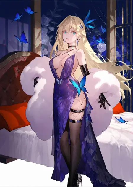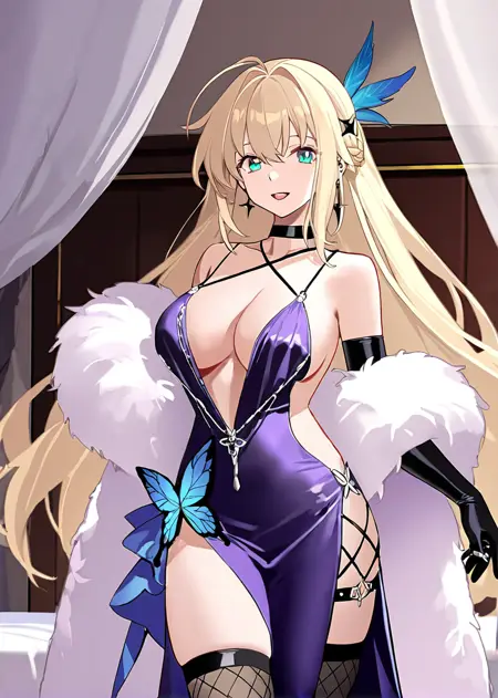 非强制性起到辅助作用的触发词为1girl, blonde hair, solo, very long hair, aqua eyes, black elbow gloves, black thighhighs, black choker, large breasts, side slit, black stiletto heels, metal fishnet thigh straps, ring, criss-cross halter, purple dress, half up braid,earrings, bare shoulders, cleavage, plunging neckline, side black spiked hair ornament, hair between eyes, blue feather hair ornament, sleeveless,white feather boa, blue butterfly waist ornament, (从某种意义来说为了还原也应该打上这些)